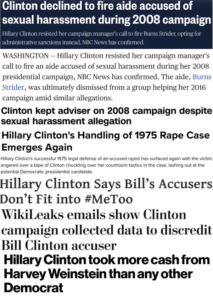 During Hillary Clinton's 2008 presidential campaign she was repeatedly warned by her own campaign staff that Clinton's campaign advisor, Burns Strider, was a serial sexual harasser and stalker who constantly and obsessively stalked and sexually harassed a female Clinton campaign worker. Hillary Clinton not only refused to fire Strider, but she re-employed Strider as an aide for her 2016 campaign. He was ultimately fired from her campaign in 2016 after he was busted engaging in even worse sexual harassment acts.