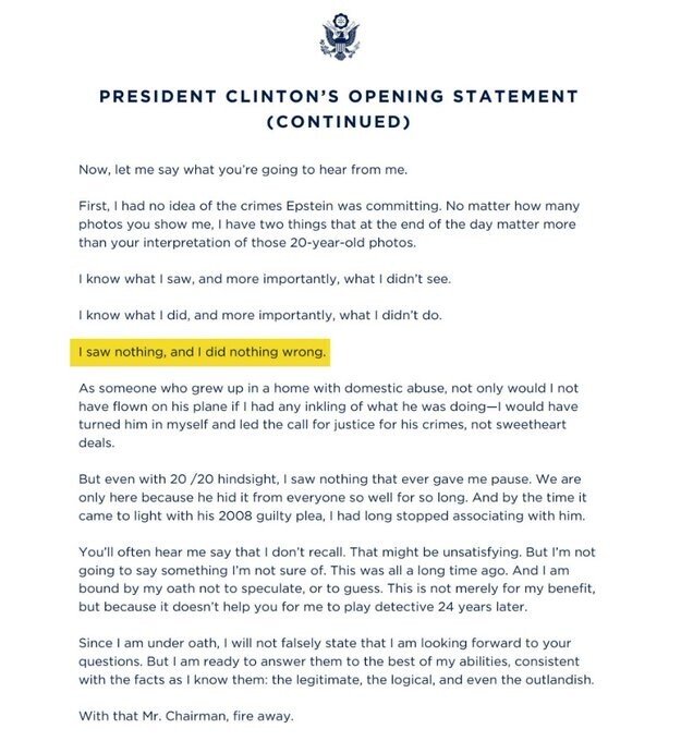 Bill Clinton, who has a long history with Epstein and took 26 flights on his plane, releases a statement saying he did “nothing wrong.”