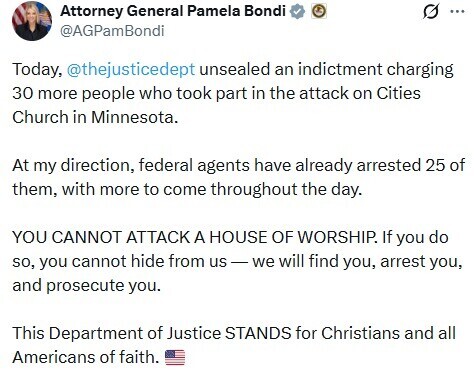 BREAKING: AG Pam Bondi announces that 30 MORE people have been charged for storming the church service in Minnesota.