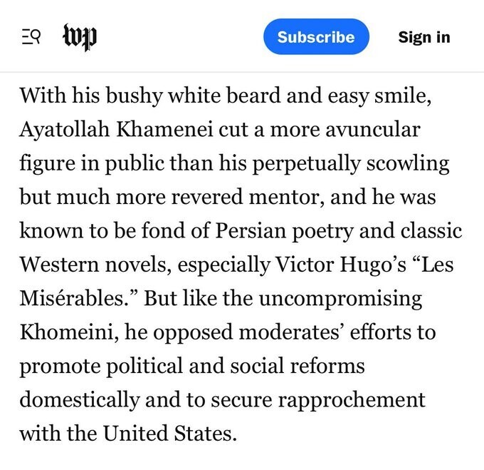 WaPo on Ayatollah Khamenei: He had a nice smile and liked poetry https://truthsocial.com/@libsoftiktok/116156078826533720