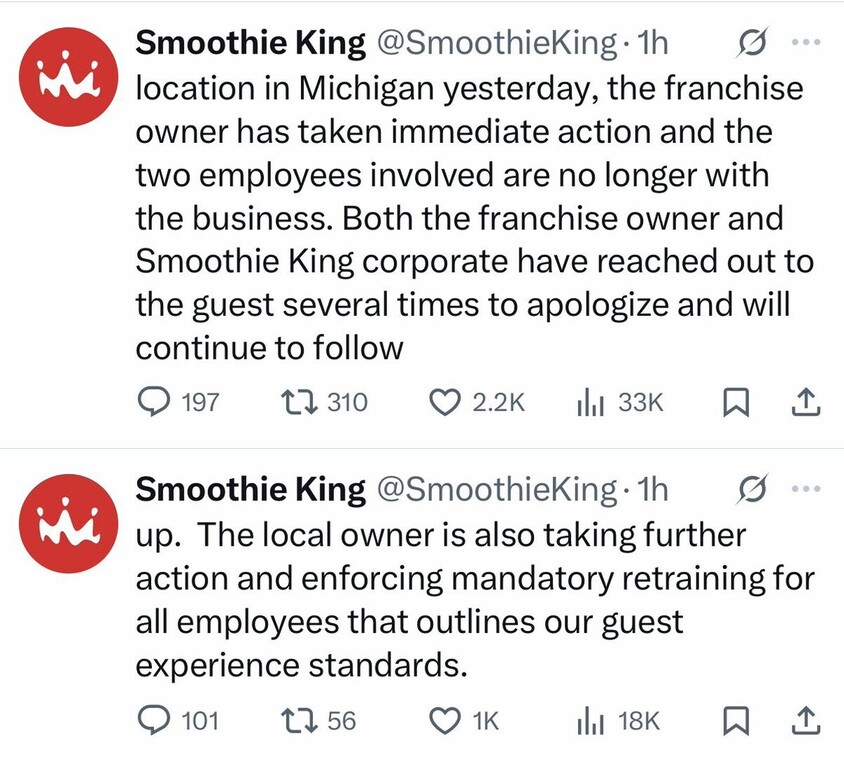 BREAKING: the two employees at Smoothie King in Michigan who refused to serve a customer with a Trump sweater have been FIRED
