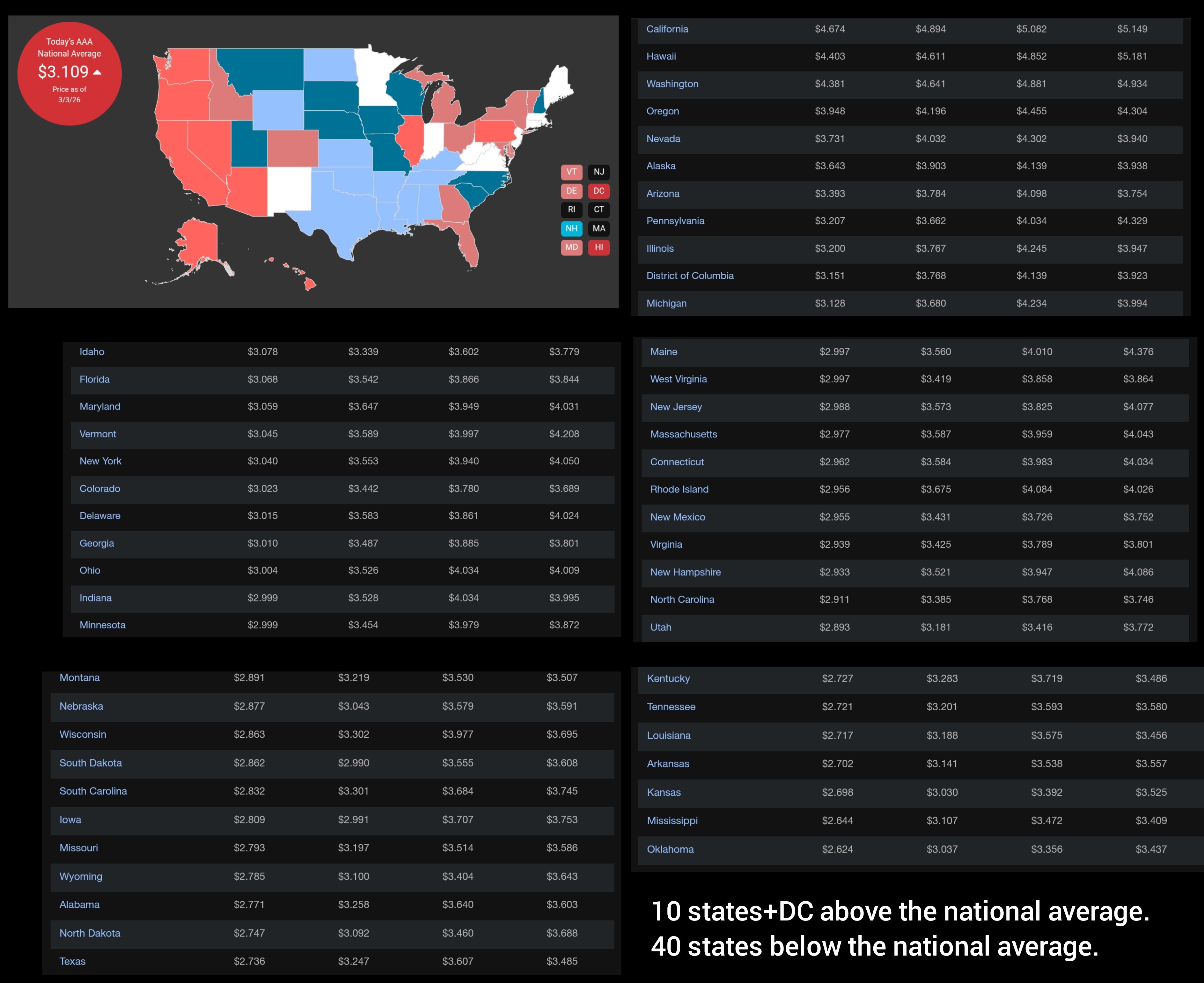 Seems to be a pattern here. Though the national average has spiked the last few days, to $3.109 a gallon the disparity between the most expensive state and the cheapest has increased. There are now 40 states below the national average and 10 above + DC. This shows the prices are increasing faster in the most expensive states faster than it is in the cheap states.