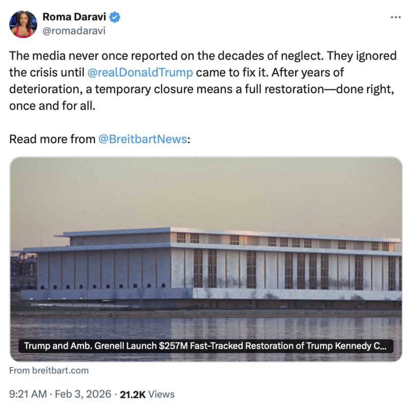 Trump and Amb. Grenell Launch $257M Fast-Tracked Restoration of Trump Kennedy Center After Years of Neglect: https://www.breitbart.com/entertainment/2026/02/02/trump-grenell-launch-257m-fast-tracked-restoration-trump-kennedy-center/ https://truthsocial.com/@realDonaldTrump/116173104270478609