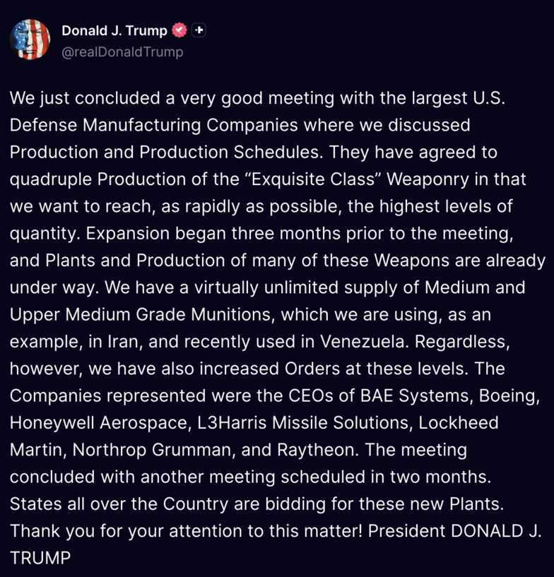 US defense companies will now quadruple the production of 'Exquisite Class' weaponry. https://truthsocial.com/@X22Report/116184351469128056