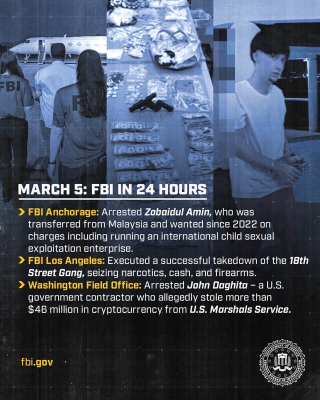 In 24 hours this FBI captured a fugitive tied to an international child exploitation ring, dismantled the 18th Street Gang in Los Angeles, and arrested a contractor accused of stealing $46M from the U.S. Marshals Service.