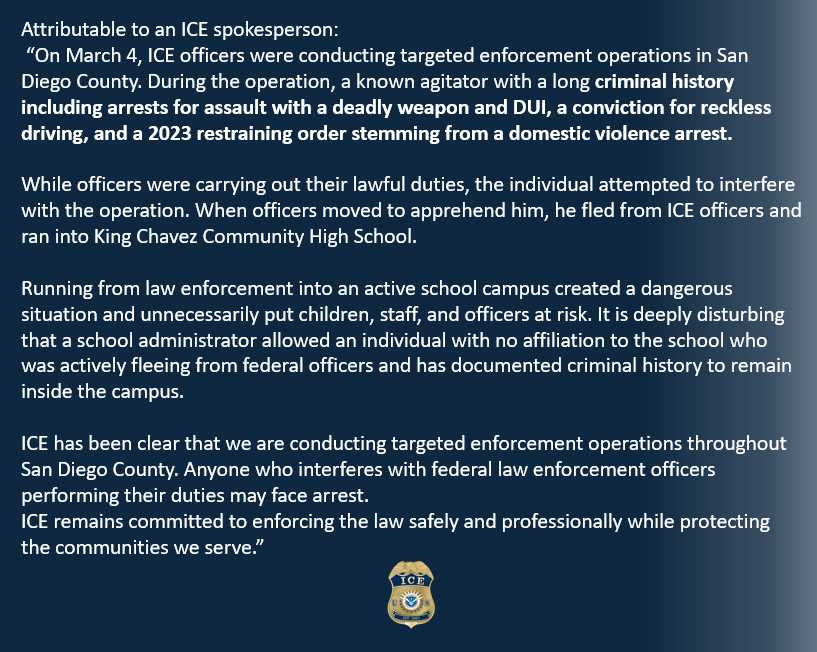ICE says it’s “deeply disturbing” that the school “allowed an individual with no affiliation to the school who was actively fleeing from federal officers and has a documented criminal history to remain inside the campus.”