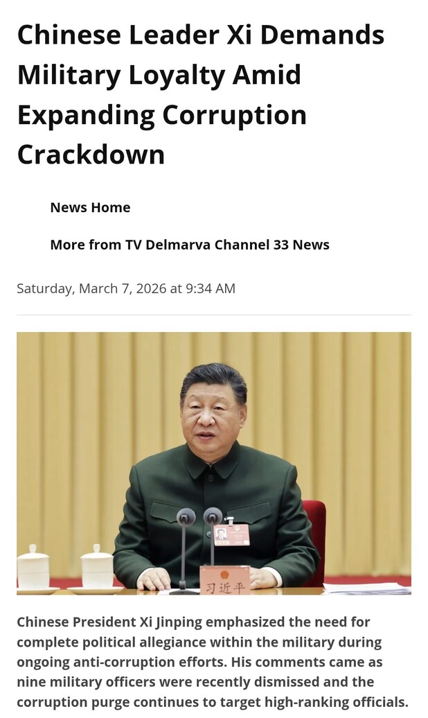 BEIJING — Chinese President Xi Jinping emphasized Saturday that complete political allegiance within the armed forces must be guaranteed while demanding continued aggressive action against corruption as military purges expand.
