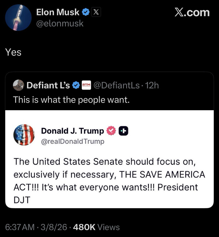 Pass the SAVE Act. https://truthsocial.com/@Qanon76/116192037651199726