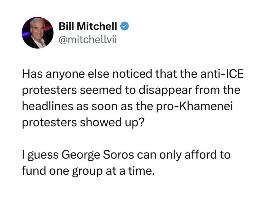 Funny how the anti-ICE protests vanished from the headlines the moment the pro-Khamenei crowds appeared. Almost like the media suddenly lost interest when the narrative got inconvenient.