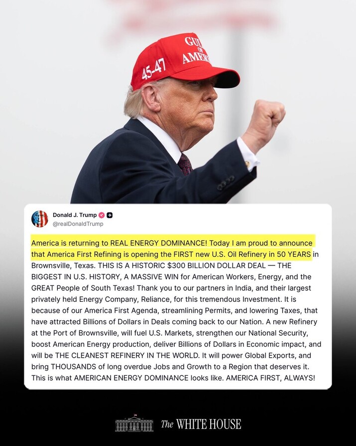 President Donald J. Trump announces that America First Refining is opening the FIRST new U.S. Oil Refinery in 50 YEARS in Brownsville, Texas. 🇺🇸