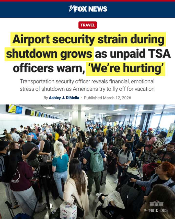 Airport security strain during shutdown grows as unpaid TSA officers warn, ‘We’re hurting’ https://truthsocial.com/@WhiteHouse/116222635828689972