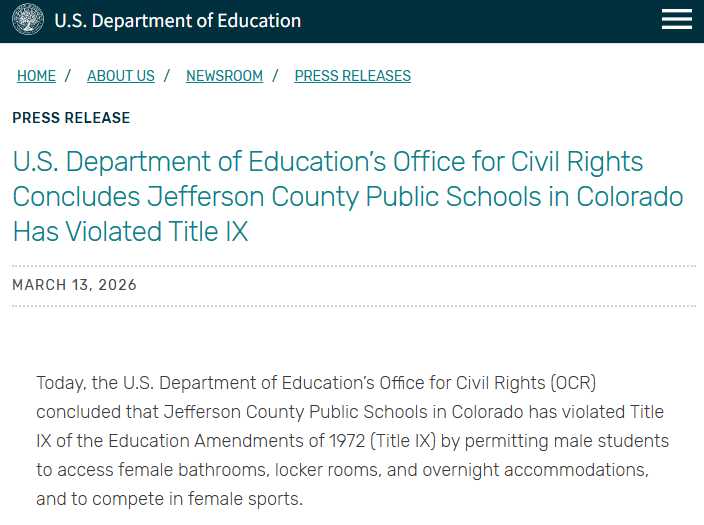 BREAKING: The U.S. Department of Education has concluded that Jeffco Public Schools in Colorado has VIOLATED Title IX by allowing males to invade female restrooms and sports.
