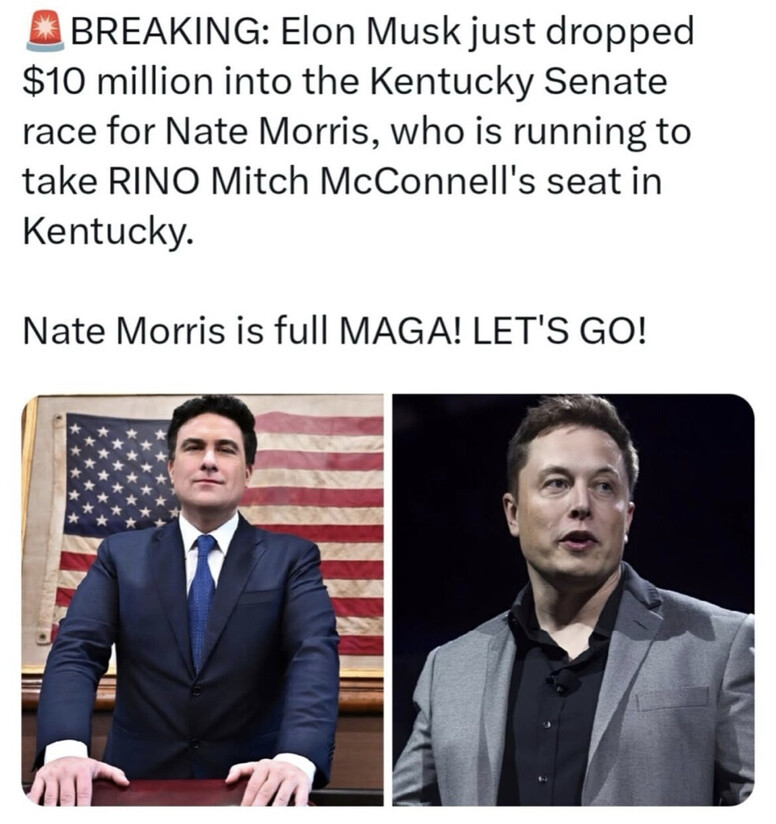 Let’s go- BREAKING: Elon Musk just HAMMERED the final nail in RINO Mitch McConnell's legacy coffin by dumping $10 MILLION straight into Nate Morris's campaign to take that fossil's Kentucky Senate seat!
