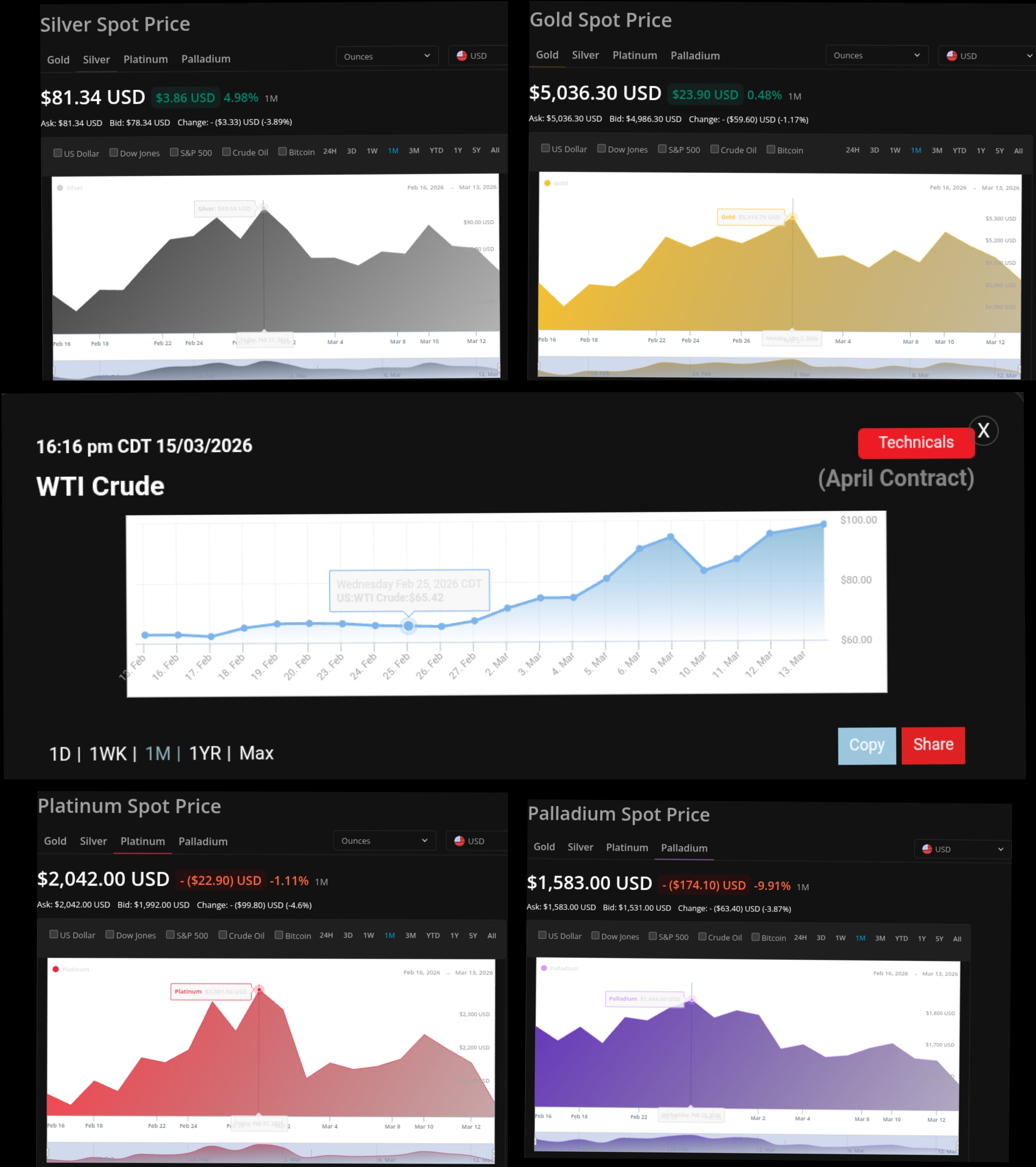 Looks like precious metals have been mirror in oil since the war with Iran began, oil goes up, precious metals go down. I found it a bit strange, especially since electronics in advanced weapons systems need them just as automobiles and computers. Also new and improved silver ion batteries being phased into electric vehicle production containing as much as 32 Oz of silver per battery.