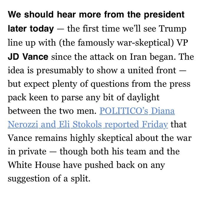 Politico is trying to sew division between Trump and Vance and convince us the WH is divided, claiming they haven’t been seen together since the Iran war started.