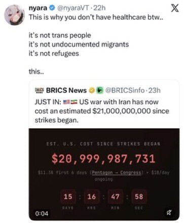 I find it deeply ironic that under Biden, when billions of taxpayers’ dollars were sent to Ukraine or spent on illegal immigration, there was never a running tally from foreign accounts showing where the money went. And yet, no one blamed the Ukraine war or illegal immigration for why Americans didn’t have “free” healthcare.