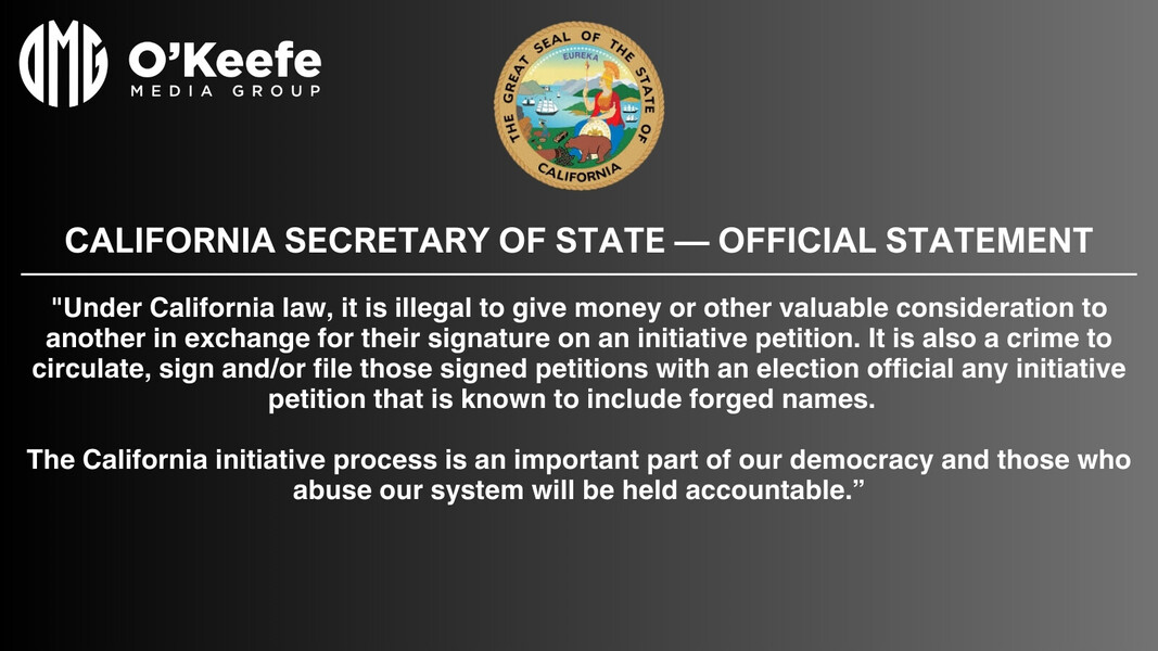 JUST NOW: CA Secretary of State Signals Prosecutions After Our New Cash-for-Signatures Video by O'Keefe https://truthsocial.com/@JamesOKeefeIII/116246714820586075