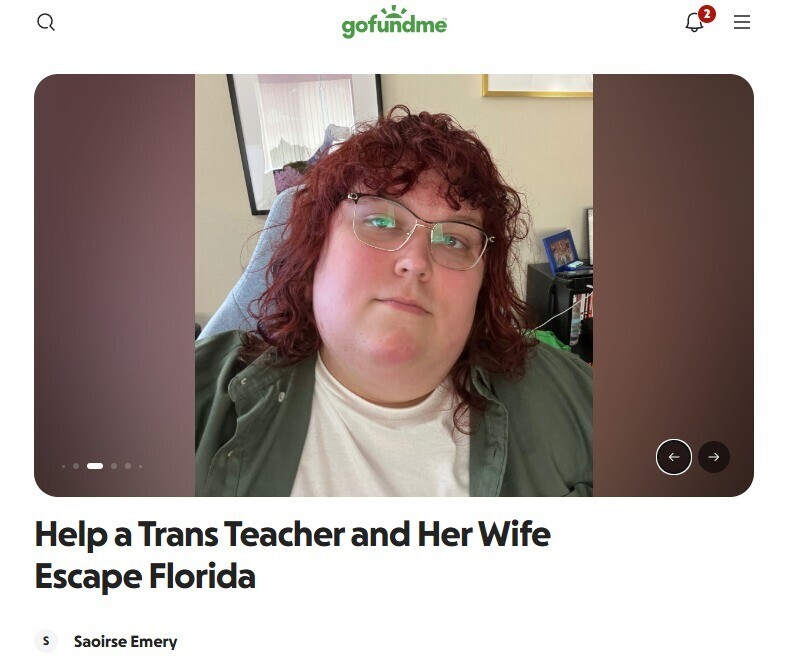 Saoirse Emery, a man pretending to be a woman, is raising money to "escape" Florida because he's a teacher and can’t push LGBTQ propaganda anymore.