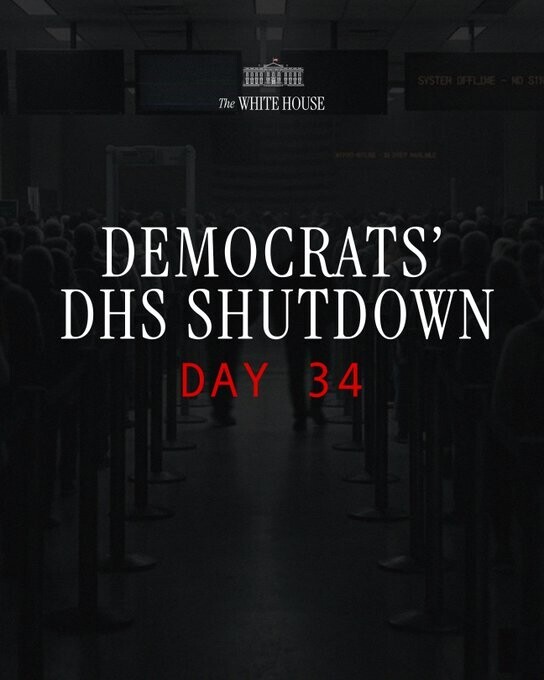 Day 34 of the Democrat Shutdown: Stop the games, drop reckless demands, & fully fund DHS. https://truthsocial.com/@WhiteHouse/116256862770276419