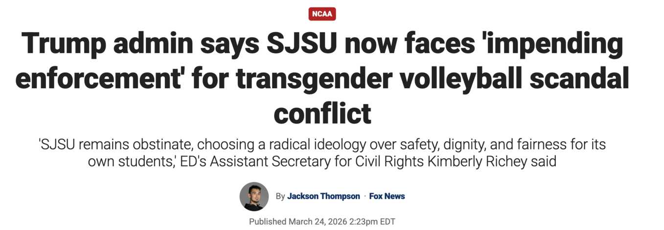 https://www.foxnews.com/sports/trump-admin-says-sjsu-now-faces-impending-enforcement-transgender-volleyball-scandal-dispute https://truthsocial.com/@EDSecMcMahon/116285667395946350