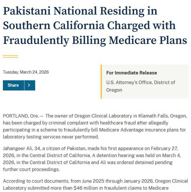 BREAKING: Pakistani national Jahangeer Ali ARRESTED for massive $46 MILLION Medicare fraud scheme.