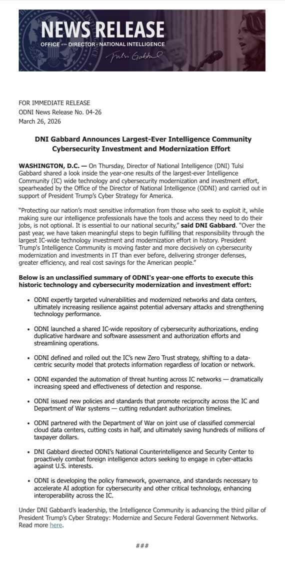 Over the past year, we have taken meaningful steps to begin fulfilling that responsibility through the largest IC-wide technology investment and modernization effort in history. President Trump's Intelligence Community is moving faster and more decisively on cybersecurity modernization and investments in IT than ever before, delivering stronger defenses, greater efficiency, and real cost savings for the American people. https://truthsocial.com/@DNITulsiGabbard/116297196702931147