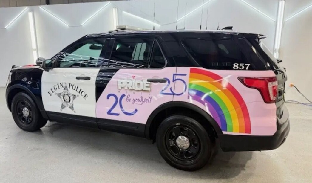The police cars and female chief of the Elgin, Illinois Police Dept that fired an officer for supporting ICE