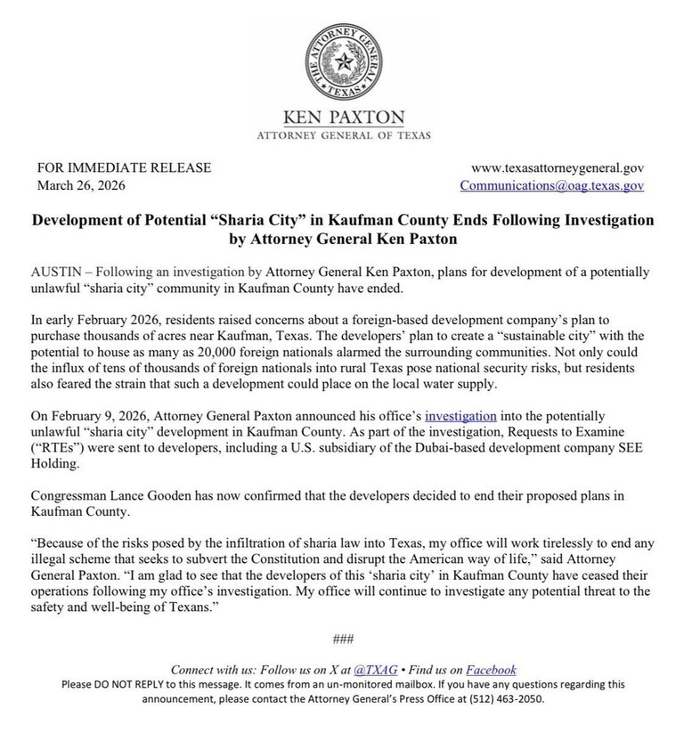 BREAKING: Texas Attorney Ken Paxton announced that the development of a "Sharia city" designed to house 20,000 foreign nationals in Kaufman County, TX, has ENDED following his investigation.