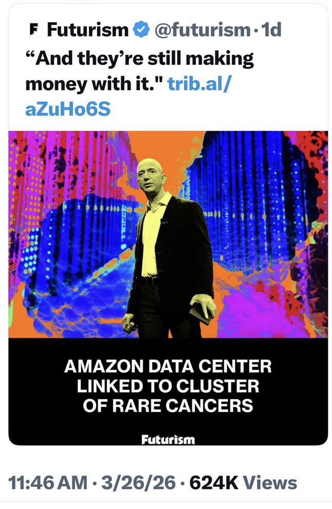 An Amazon data center in Oregon went online in 2011. It has since poisoned “the deepest reaches of the local aquifer,” & is causing cancer/rare diseases.