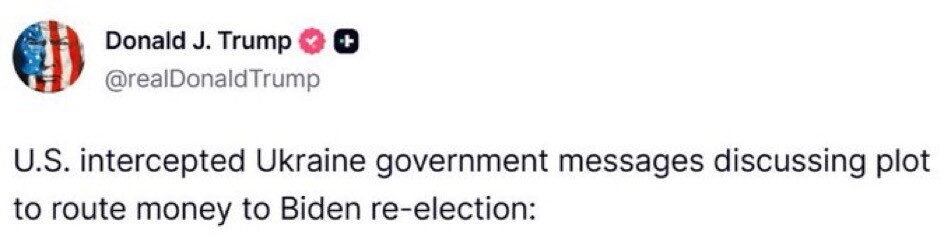 RT: U.S. intercepted Ukraine government messages discussing plot to route money to Biden re-election: https://justthenews.com/government/security/nsa-intercepted-ukraine-government-messages-discussing-effort-route-money-2024 https://truthsocial.com/@realDonaldTrump/116295060276845350