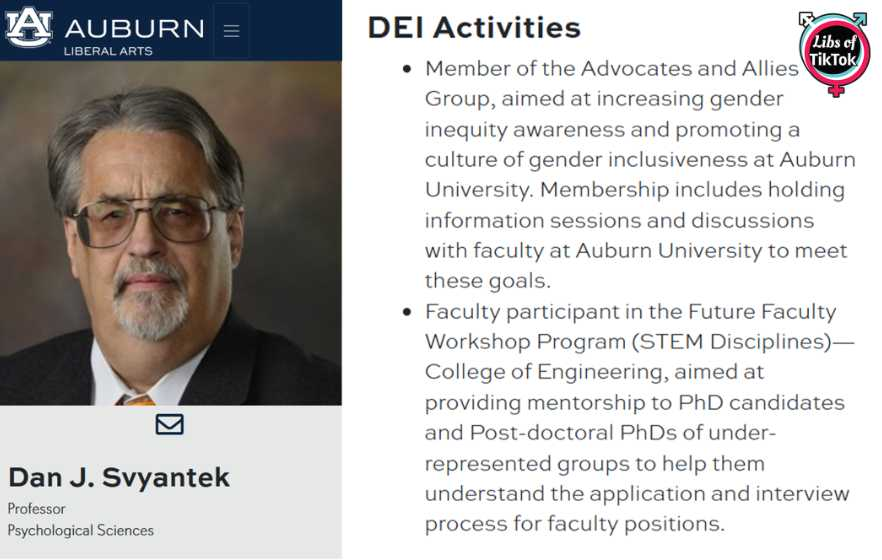 Meet Dan J. Svyantek, a professor at Auburn University College of Liberal Arts in Alabama, who proudly lists the "DEI Activities" he's involved with at this taxpayer-funded university.