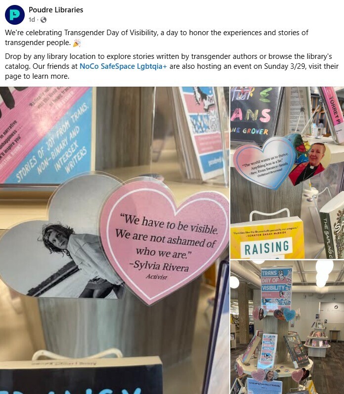 WOW. Poudre Libraries in Colorado set up a display promoting transgender and LGBTQ activists for "Trans Day of Visibility."