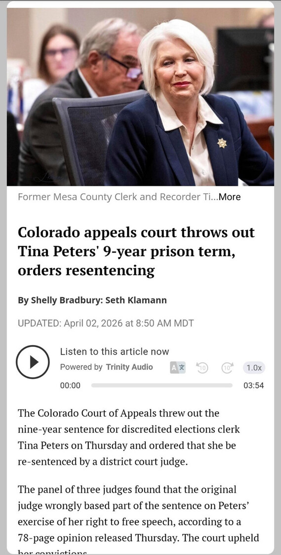 Tina Peters is a political prisoner who has been subjected to cruel and unusual punishment in violation of her 1st and 8th Amendment rights for the “crime” of exposing Democrat election fraud.