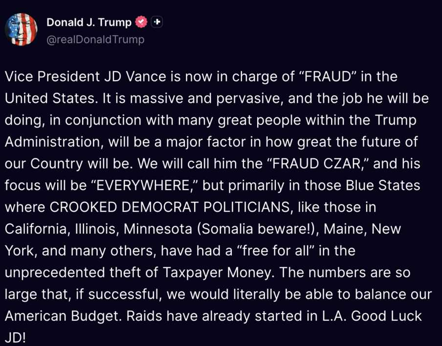 Trump has named JD Vance the U.S. fraud czar. https://truthsocial.com/@X22Report/116340897009423801
