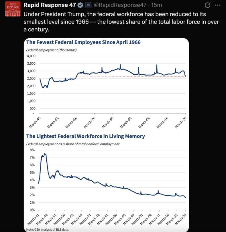 Under President Trump, the federal workforce has been reduced to its smallest level since 1966 — the lowest share of the total labor force in over a century.