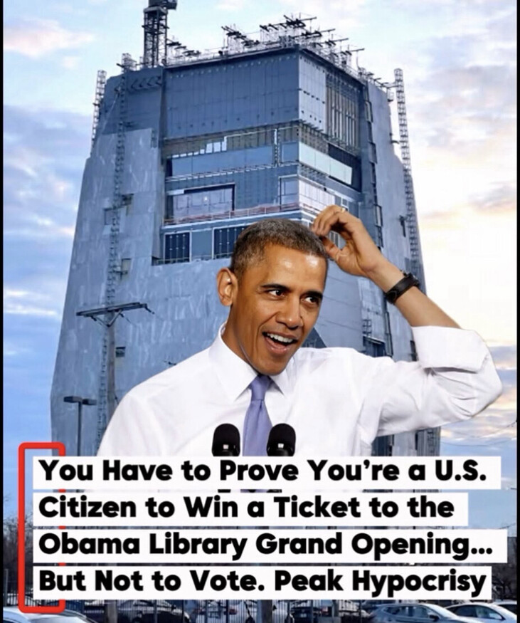 "You have to prove you're a U.S. citizen or legal permanent resident to win a ticket to the Obama Library grand opening... but not to vote. Peak hypocrisy," the viral meme blared, capturing former President Obama's trademark half-smile and head-scratch in front of the still-rising tower. https://truthsocial.com/@Qanon76/116345460303779972