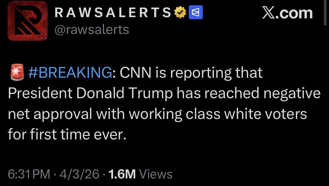If CNN says President Trump just hit negative approval with working-class white voters for the first time ever… it probably means his approval is through the roof and they’re in full panic mode again. https://truthsocial.com/@Qanon76/116346270747811304