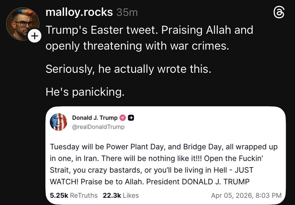 Libs today: The President of the United States is commemorating Easter by threatening war crimes… and dropping an F-bomb.