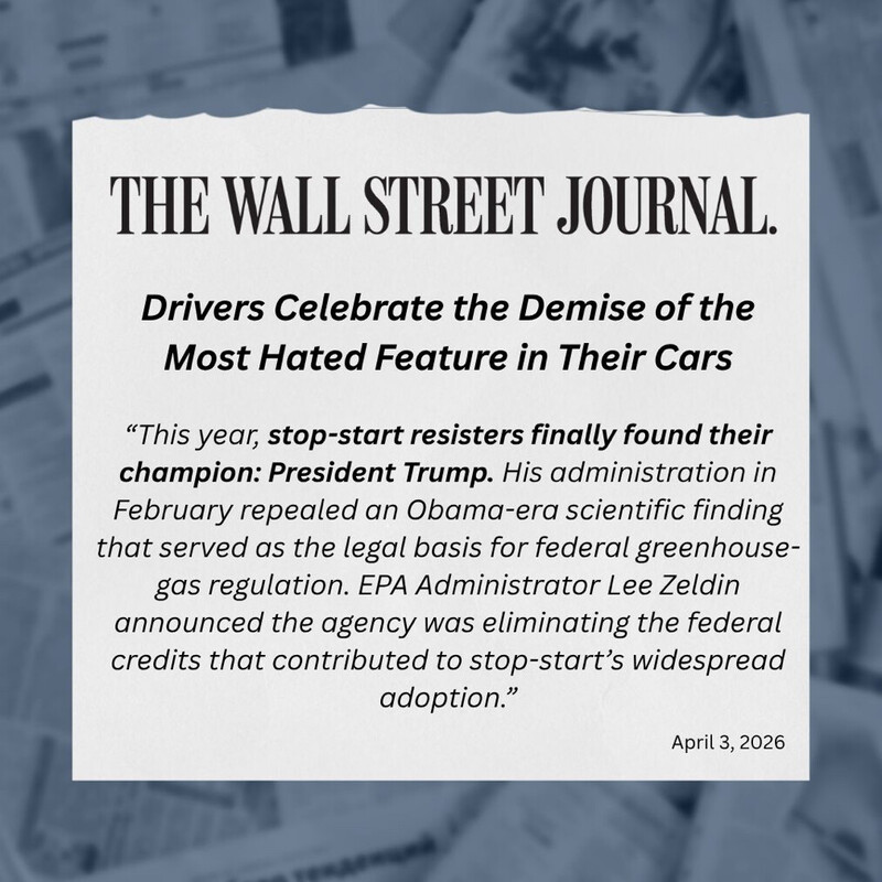 As part of the BIGGEST DEREGULATORY ACTION IN US HISTORY, the Trump EPA ELIMINATED all off-cycle credits that incentivized installation of the almost UNIVERSALLY DESPISED start/stop feature in vehicles. There will be no more climate participation trophies to manufacturers for making your vehicle die at every red light and stop sign! https://truthsocial.com/@epaleezeldin/116359677123495149