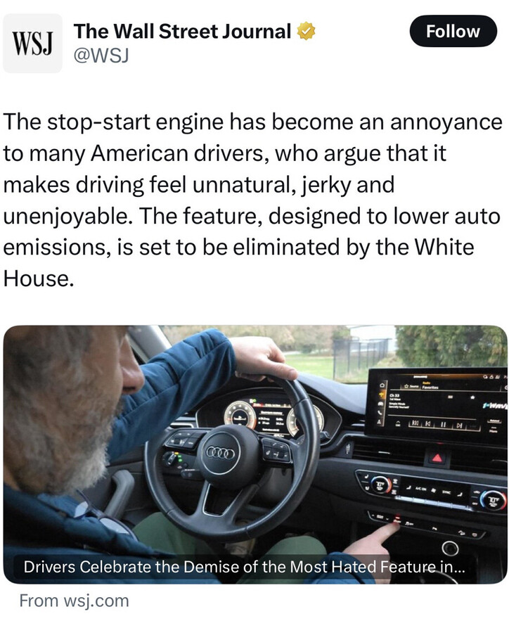 The start/stop concept in vehicles is almost universally DESPISED. So, the Trump EPA has now REMOVED the ridiculous climate participation trophy the Obama Admin created to get this hated feature installed. The incentives for manufacturers to make your car die at every red light and stop sign have now been ELIMINATED! https://truthsocial.com/@epaleezeldin/116369954975205901