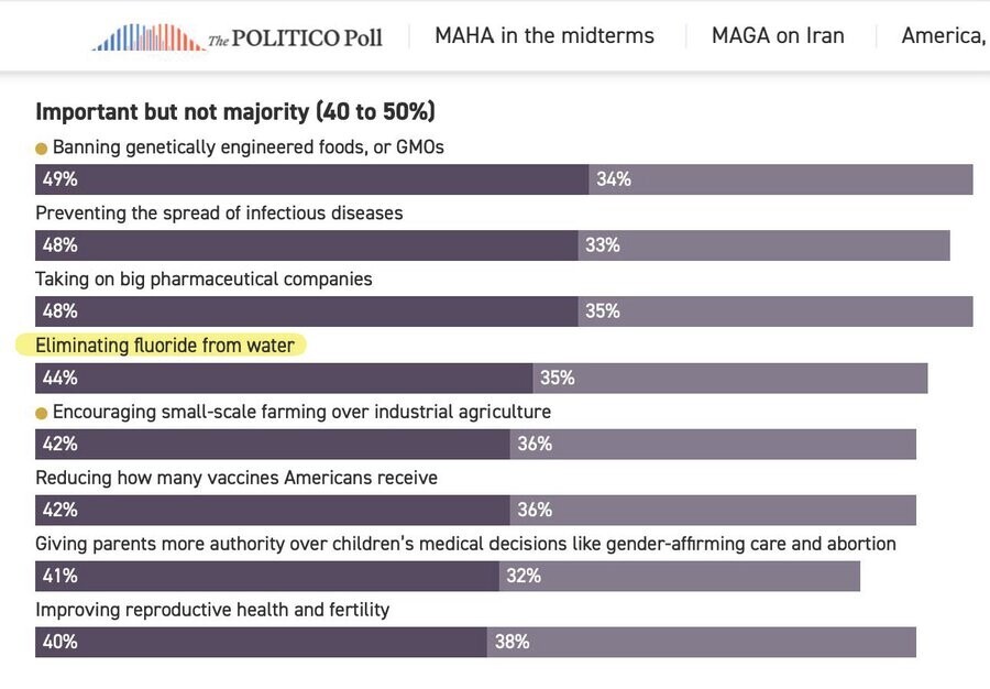 "Eliminating fluoride in water --- something Kennedy has pushed for — has 67 percent MAHA support, and 43 percent support from the general public.