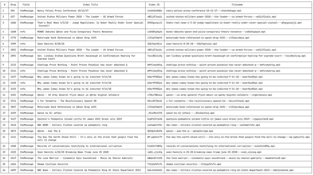 Ok - all the drops listed here have been updated with an archived video link. I was able to rescue 21 of 28 missing videos (6 of the 7 are fox news ones - impossible to find really, the last is a link to out of shadows which is readily available).